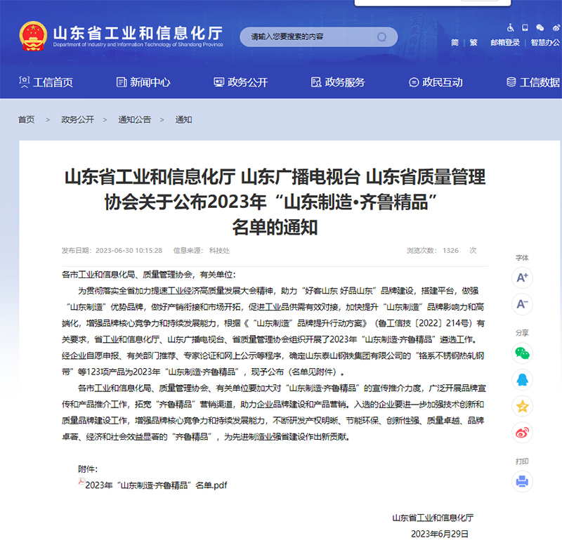 “山東制造·齊魯精品”旨在貫徹落實全省加力提速工業(yè)經(jīng)濟高質(zhì)量發(fā)展大會精神,助力”好客山東 好品山東”品牌建設(shè),面向全省標志性重點產(chǎn)業(yè)鏈領(lǐng)域,避選產(chǎn)權(quán)明晰、節(jié)能環(huán)保、創(chuàng)新性強、質(zhì)量卓越、品牌卓著、經(jīng)濟和社會效益顯著的產(chǎn)品,做強”山東制造”優(yōu)勢品牌。