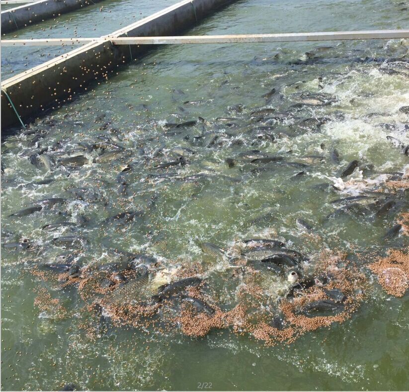 李經(jīng)理的工程養(yǎng)殖中心共有12個(gè)方形魚池,4個(gè)池養(yǎng)殖10000尾鯽魚,2個(gè)池養(yǎng)殖8000尾草魚,其余6個(gè)池養(yǎng)殖羅非魚,養(yǎng)殖密度比常規(guī)魚塘大5倍。這么大的密度,魚的成活率與品質(zhì)如何?農(nóng)場(chǎng)場(chǎng)主李經(jīng)理現(xiàn)場(chǎng)演示,揭開謎底。魚池一頭深1.7米,另一頭1.5米,底部形成20厘米的斜坡。他開動(dòng)羅茨風(fēng)機(jī),水底的鼓風(fēng)機(jī)通過曝氣裝置,將水流推向水面,與上面擋水板形成沖浪,順著斜坡擠向低處,不斷地循環(huán)往返,整個(gè)水池被攪動(dòng),所有的魚都“被沖浪”!棒~每天還要‘跳高’!笔褂脩腋★暳希褪亲岕~必須要跳上來才能吃到,這樣整天“鍛煉”,自然“身強(qiáng)力壯”。生長(zhǎng)速度加快一倍,投放時(shí)3兩重的草魚已經(jīng)長(zhǎng)到1斤,鯽魚從2.5錢長(zhǎng)到5錢。