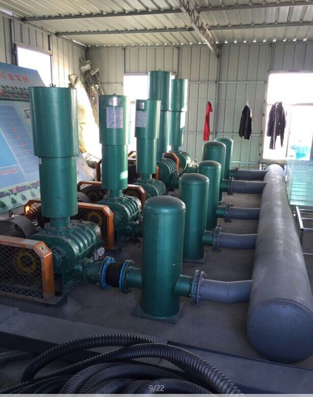 羅茨風(fēng)機(jī)主要由墻板、機(jī)殼及兩個(gè)裝有葉輪的轉(zhuǎn)子組成。通過一對(duì)同步齒輪的作用,使兩轉(zhuǎn)子呈反方向等速旋轉(zhuǎn),并依靠葉輪與葉輪之間、葉輪與機(jī)殼之間的間隙,使吸氣腔和排氣腔基本隔絕,借助于葉輪旋轉(zhuǎn)、推動(dòng)機(jī)殼容積內(nèi)氣體,達(dá)到鼓風(fēng)之目的。